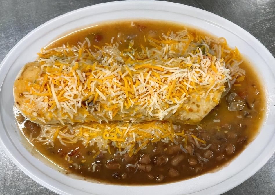 Your choice of bacon, sausage or ham with hash browns, scrambled eggs and cheese wrapped in a flour tortilla and smothered in homemade green chili. Topped with shredded cheese