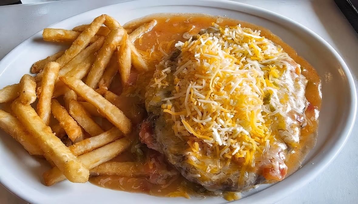 Opened faced hamburger smothered with homemade green chili, served with 1 side