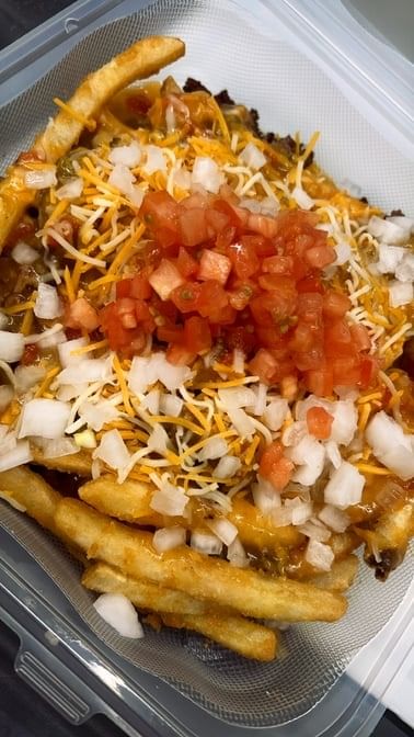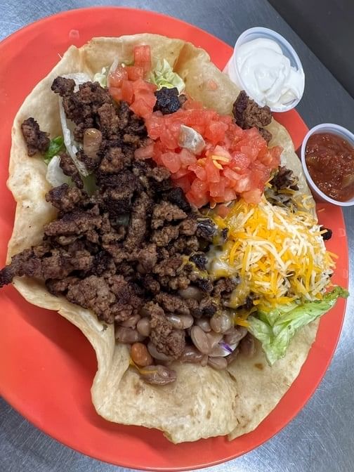 Topped with ground beef, tomatoes, onion, sour cream, and shredded cheese