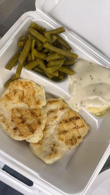 Breaded and seasoned chicken breast (boneless) fried to golden perfection, topped with our white gravy and served with your choice of two sides