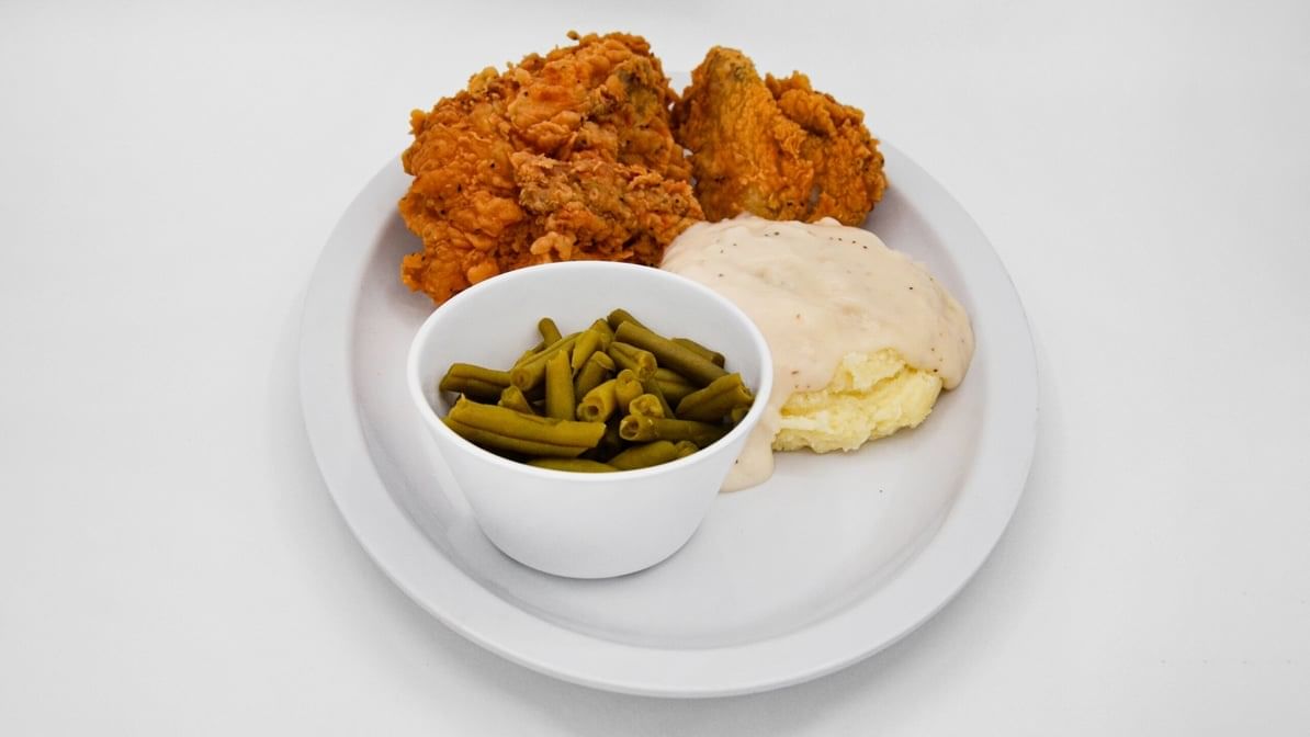 Two pieces of fried chicken served with your choice of two sides. All white $1.99 & dark options available