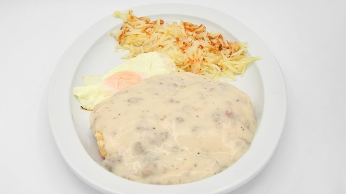 1 biscuit smothered in sausage gravy, 1 egg, and hash browns