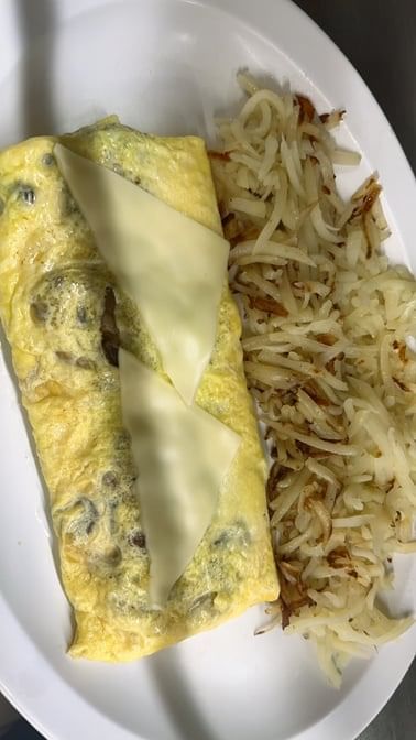 Three eggs filled with grilled mushrooms and melted Swiss cheese. Served with hash browns and choice of toast or pancakes