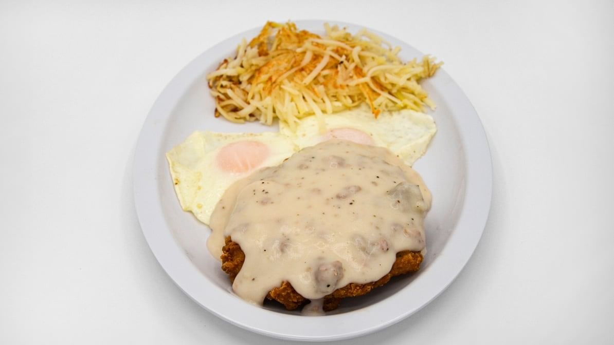 Breaded, seasoned beef steak smothered in our sausage gravy. Served with two eggs any style, hash browns and your choice of toast or pancakes