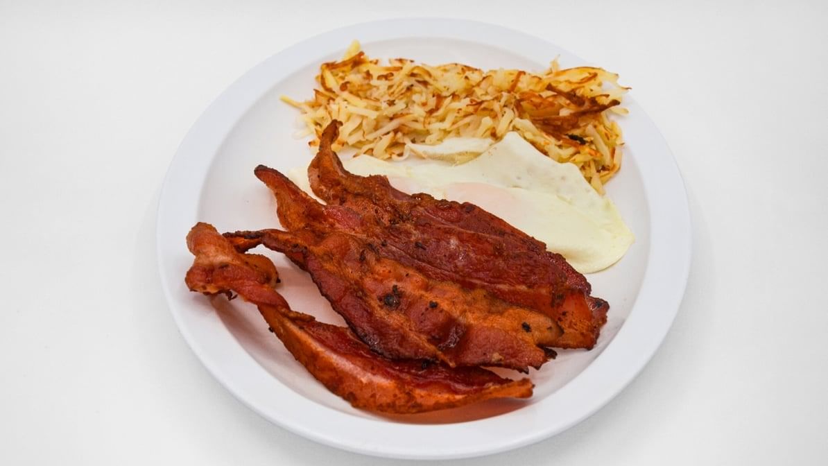 One egg any style served with hash browns and your choice of 2 strips of bacon or sausage links and toast or pancakes