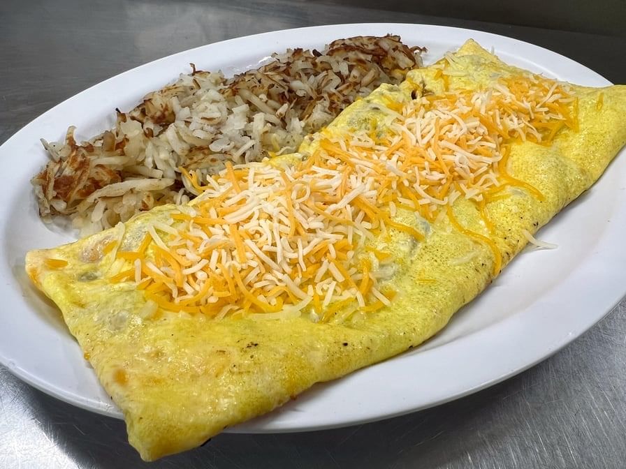 Three eggs filled with shredded cheese and your choice of bacon, ham or sausage. Served with hash browns and toast or pancakes